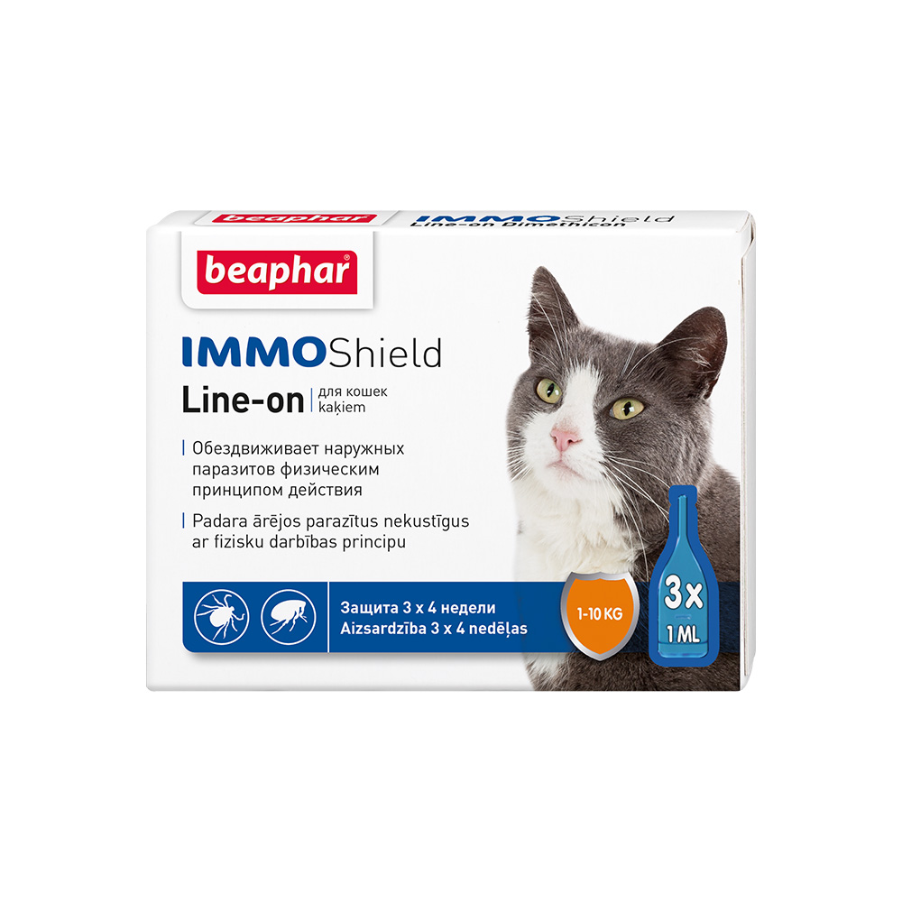 Beaphar Immo Shield Line-on - ანტიპარაზიტული წვეთები, რომელიც გამოიყენება 12 კვირის ასაკიდან, 1 კგ-დან 10 კგ-მდე წონის კატებზე. წვეთები შეიცავს დიმეთიკონს (სილიკონის ზეთი), რომელიც კანზე ზედაპირულ ფენას ქმნის და მექანიკურად ანეიტრალებს პარაზიტებს (ტკიპები, რწყილები, ტილები და კოღოები). არ შეიცავს ქიმიურ ინსექტიციდებს.