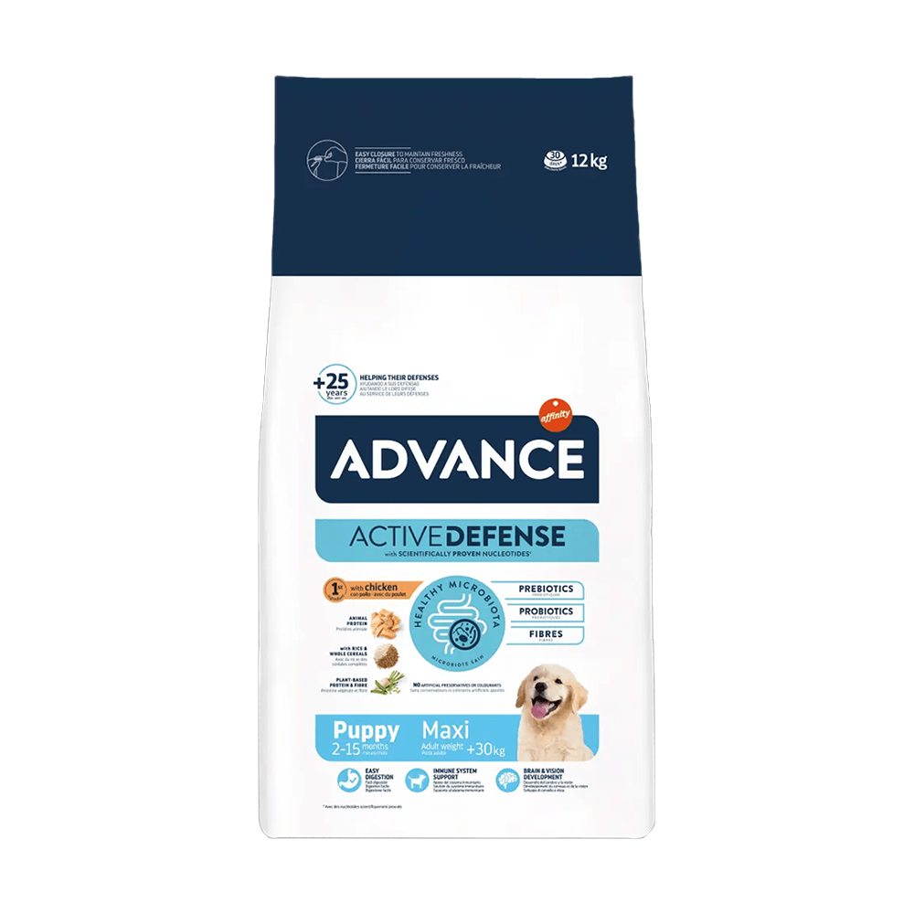 Advance - Puppy Maxi სუპერ პრემიუმ კლასის მშრალი საკვები დიდი ჯიშის ლეკვებისთვის(ზრდასრულობისას 30 კგ-ზე მეტი). საკვები დამზადებულია ქათმის ხორცითა და ბრინჯით, შეიცავს გლუკოზამინს, ხონდროიტინს და ყველა იმ დანამატს რომელიც აუცილებელია დიდი ჯიშის ლეკვების სწორი განვითარებისთვის.